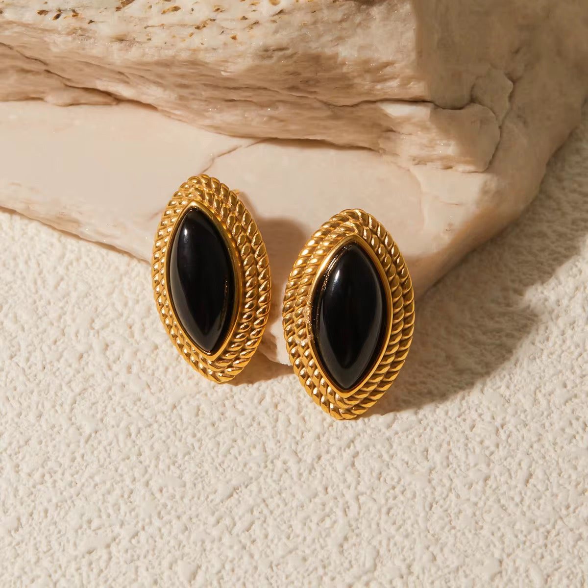 Elevate your look with these Golden Almond Stud Earrings — a perfect harmony of vibrant blue, black or white stone and luxurious gold detailing. Featuring an oval turquoise centerpiece framed by a twisted gold rope design, these earrings bring a touch of bohemian charm and vintage sophistication to any outfit.