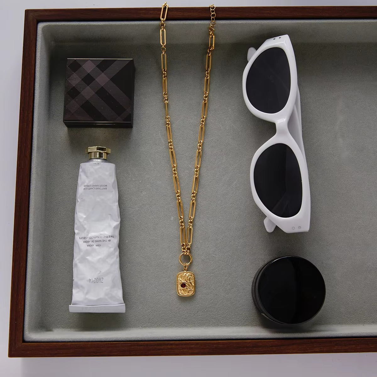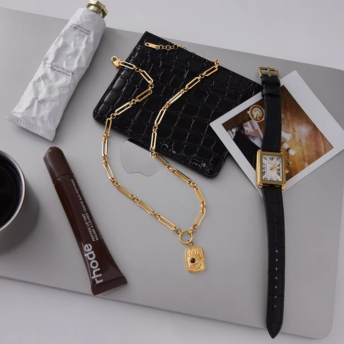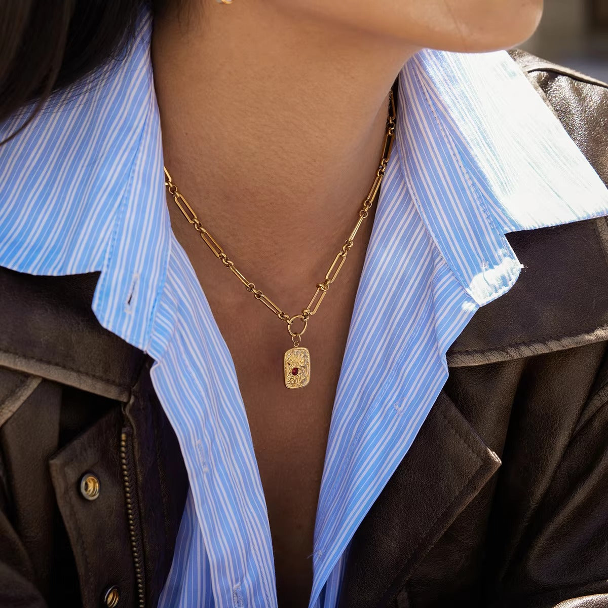 Elevate your everyday style with the Regal Red Coin Necklace — a timeless blend of sophistication and artistry. Crafted from premium 316L stainless steel and plated in 18K gold PVD, this necklace radiates a warm, luxurious glow that resists tarnishing for years. The rectangular pendant features intricate vintage-inspired engravings adorned with a deep red rhinestone at its center, symbolizing strength and elegance.
