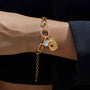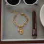 The Elysian Charm Chain Bracelet channels ancient elegance with a touch of modern luxury. Made from 18K gold-plated stainless steel, it features a bold link chain adorned with an Egyptian-style engraved charm, accented by a white and red zircon for a hint of celestial sparkle.